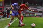 Toluca, Estado de México, 5 de enero de 2026. Deneisha Blackwood y Michel Fong, durante el partido correspondiente a la jornada 1 del torneo Clausura 2026 de la Liga BBVA MX Femenil, entre las Diablas Rojas del Toluca y las Xolas de Tijuana, realizado en el estadio Nemesio Diez. Foto: Imago7/ Arturo Hernández