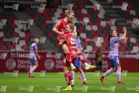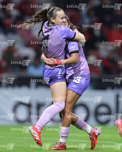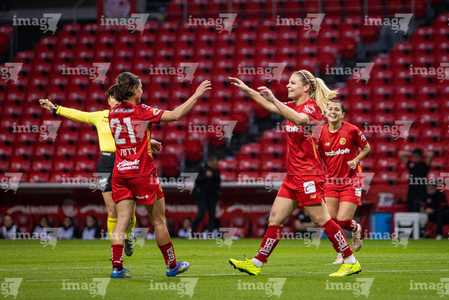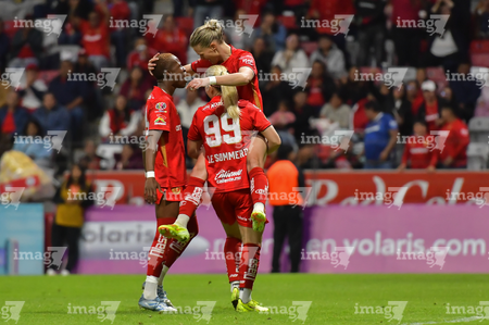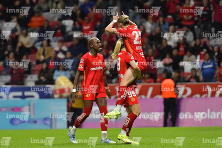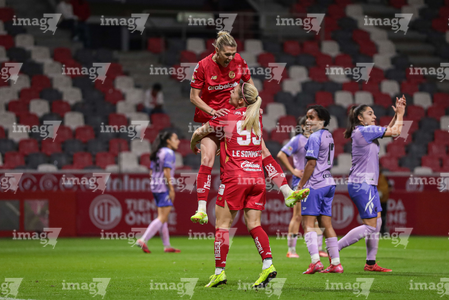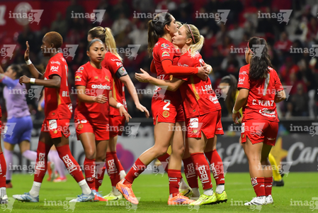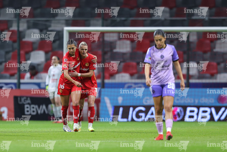 Toluca, Estado de México, 5 de enero de 2026. Eugenie Le Sommer y Kayla Fernandez en festejo de gol, durante el partido correspondiente a la jornada 1 del torneo Clausura 2026 de la Liga BBVA MX Femenil, entre las Diablas Rojas del Toluca y las Xolas de Tijuana, realizado en el estadio Nemesio Diez. Foto: Imago7/Daniel Arriaga