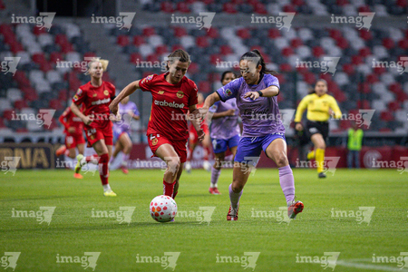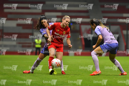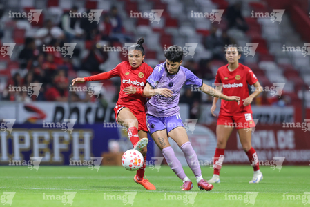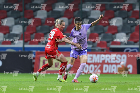 Toluca, Estado de México, 5 de enero de 2026. Kader Hançar y Mitsy Ramírez, durante el partido correspondiente a la jornada 1 del torneo Clausura 2026 de la Liga BBVA MX Femenil, entre las Diablas Rojas del Toluca y las Xolas de Tijuana, realizado en el estadio Nemesio Diez. Foto: Imago7/ Arturo Hernández