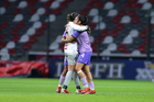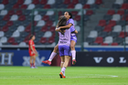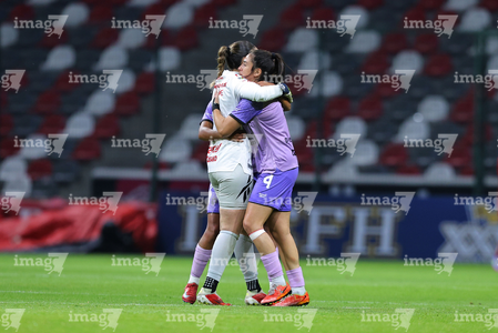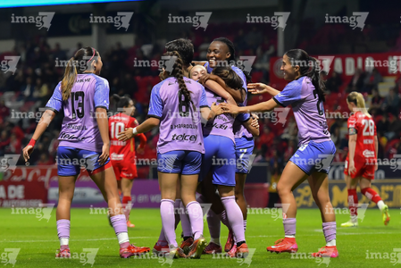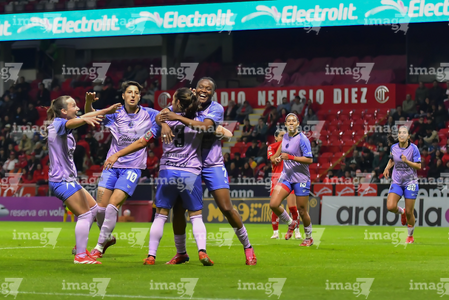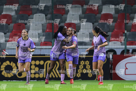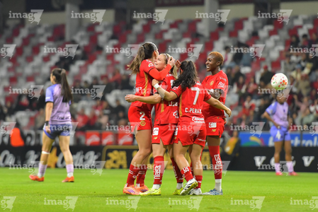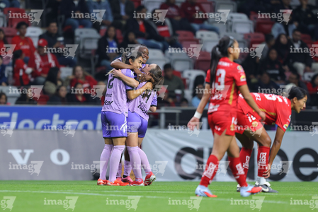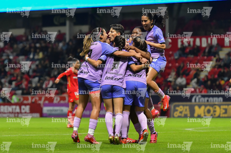 Toluca, Estado de México, 5 de enero de 2026. Jugadoras de Xolas en festejo de gol durante el partido correspondiente a la jornada 1 del torneo Clausura 2026 de la Liga BBVA MX Femenil, entre las Diablas Rojas del Toluca y las Xolas de Tijuana, realizado en el estadio Nemesio Diez. Foto: Imago7/ Jesús Esquivel