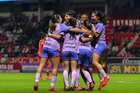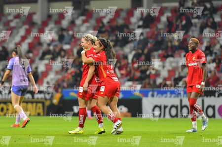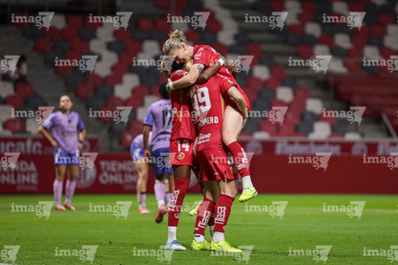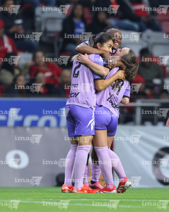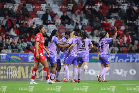 Toluca, Estado de México, 5 de enero de 2026. Jugadoras de Xolas en festejo de gol, durante el partido correspondiente a la jornada 1 del torneo Clausura 2026 de la Liga BBVA MX Femenil, entre las Diablas Rojas del Toluca y las Xolas de Tijuana, realizado en el estadio Nemesio Diez. Foto: Imago7/ Arturo Hernández