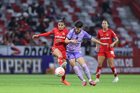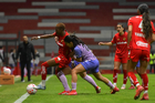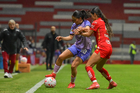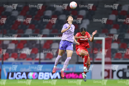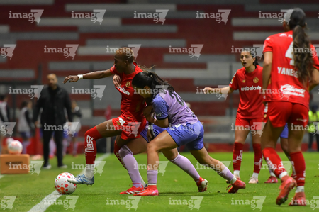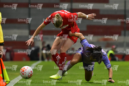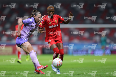 Toluca, Estado de México, 5 de enero de 2026. Michel Fong y Deneisha Blackwood, durante el partido correspondiente a la jornada 1 del torneo Clausura 2026 de la Liga BBVA MX Femenil, entre las Diablas Rojas del Toluca y las Xolas de Tijuana, realizado en el estadio Nemesio Diez. Foto: Imago7/ Jesús Esquivel