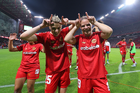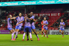 Toluca, Estado de México, 5 de enero de 2026. Faustine Robert, Eugenie Le Sommer y Deneisha Blackwood en festejo de gol, durante el partido correspondiente a la jornada 1 del torneo Clausura 2026 de la Liga BBVA MX Femenil, entre las Diablas Rojas del Toluca y las Xolas de Tijuana, realizado en el estadio Nemesio Diez. Foto: Imago7/Daniel Arriaga