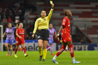 Toluca, Estado de México, 5 de enero de 2026. Lee Fernanda Natasha Galán, árbitra central muestra tarjeta amarilla de amonestación a Deneisha Blackwood, durante el partido correspondiente a la jornada 1 del torneo Clausura 2026 de la Liga BBVA MX Femenil, entre las Diablas Rojas del Toluca y las Xolas de Tijuana, realizado en el estadio Nemesio Diez. Foto: Imago7/ Arturo Hernández