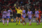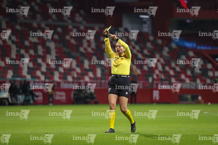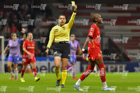 Toluca, Estado de México, 5 de enero de 2026. Lee Fernanda Natasha Galán, árbitra central muestra tarjeta amarilla de amonestación, durante el partido correspondiente a la jornada 1 del torneo Clausura 2026 de la Liga BBVA MX Femenil, entre las Diablas Rojas del Toluca y las Xolas de Tijuana, realizado en el estadio Nemesio Diez. Foto: Imago7/ Arturo Hernández