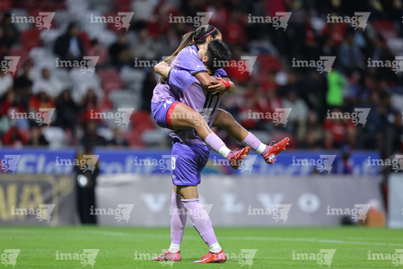Toluca, Estado de México, 5 de enero de 2026. Eugenie Le Sommer y Faustine Robert en festejo de gol, durante el partido correspondiente a la jornada 1 del torneo Clausura 2026 de la Liga BBVA MX Femenil, entre las Diablas Rojas del Toluca y las Xolas de Tijuana, realizado en el estadio Nemesio Diez. Foto: Imago7/Daniel Arriaga