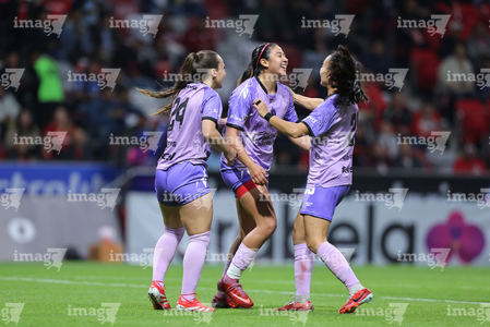 Toluca, Estado de México, 5 de enero de 2026. Karen Díaz, Amogelang Motau y Michel Fong en festejo de gol, durante el partido correspondiente a la jornada 1 del torneo Clausura 2026 de la Liga BBVA MX Femenil, entre las Diablas Rojas del Toluca y las Xolas de Tijuana, realizado en el estadio Nemesio Diez. Foto: Imago7/ Jesús Esquivel