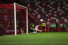 Toluca, Estado de México, 5 de enero de 2026. Eugenie Le Sommer anota gol de penal, durante el partido correspondiente a la jornada 1 del torneo Clausura 2026 de la Liga BBVA MX Femenil, entre las Diablas Rojas del Toluca y las Xolas de Tijuana, realizado en el estadio Nemesio Diez. Foto: Imago7/ Arturo Hernández