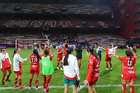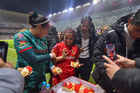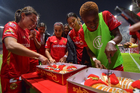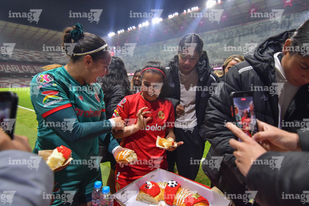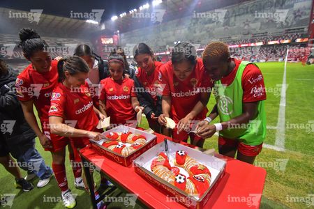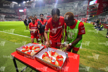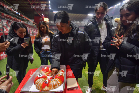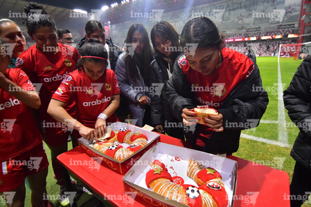 Toluca, Estado de México, 5 de enero de 2026. Jugadoras del Toluca femenil partieron una rosca de reyes, durante el partido correspondiente a la jornada 1 del torneo Clausura 2026 de la Liga BBVA MX Femenil, entre las Diablas Rojas del Toluca y las Xolas de Tijuana, realizado en el estadio Nemesio Diez. Foto: Imago7/ Arturo Hernández
