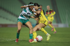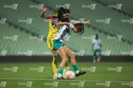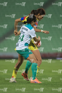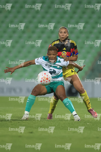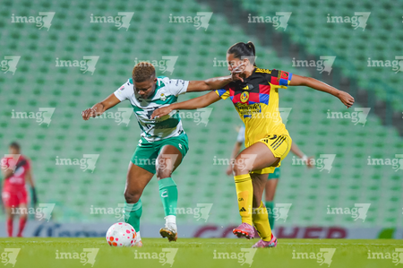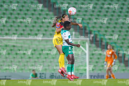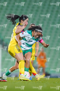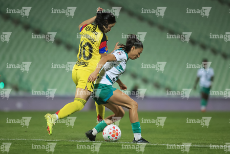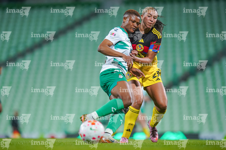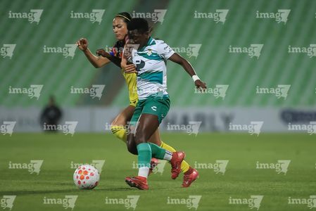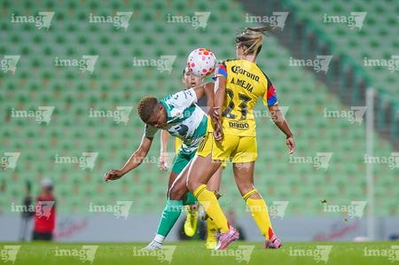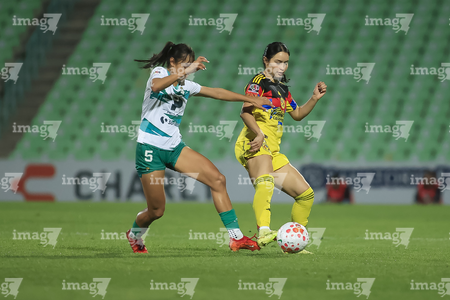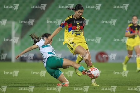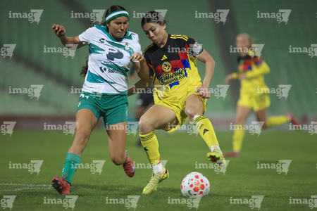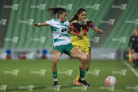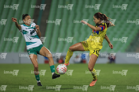 Torreón, Coahuila, 5 de enero de 2026. Mariela Ramos y Sandra Nabweteme, durante el partido correspondiente a la jornada 1 del torneo Clausura 2026 de la Liga BBVA MX Femenil, entre las Guerreras de Santos Laguna y las Águilas del América, realizado en el estadio Corona. Foto: Imago7/Saul Perales