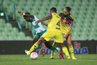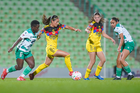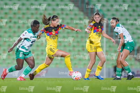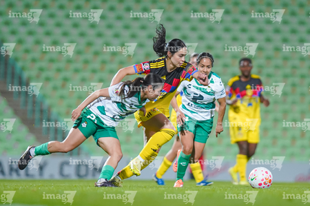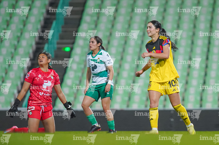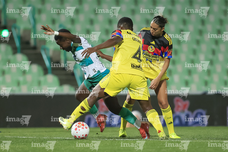 Torreón, Coahuila, 5 de enero de 2026. Lia Romero, Sandra Nabweteme y Anahí Gómez, durante el partido correspondiente a la jornada 1 del torneo Clausura 2026 de la Liga BBVA MX Femenil, entre las Guerreras de Santos Laguna y las Águilas del América, realizado en el estadio Corona. Foto: Imago7/Saul Perales