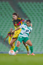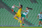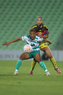 Torreón, Coahuila, 5 de enero de 2026. Jana Gutiérrez y Montserrat Saldivar, durante el partido correspondiente a la jornada 1 del torneo Clausura 2026 de la Liga BBVA MX Femenil, entre las Guerreras de Santos Laguna y las Águilas del América, realizado en el estadio Corona. Foto: Imago7/ Erick Saavedra