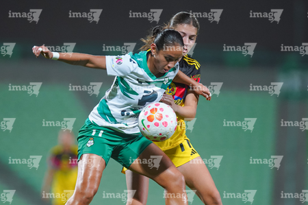 Torreón, Coahuila, 5 de enero de 2026. Judith Felix y Scarlett Camberos, durante el partido correspondiente a la jornada 1 del torneo Clausura 2026 de la Liga BBVA MX Femenil, entre las Guerreras de Santos Laguna y las Águilas del América, realizado en el estadio Corona. Foto: Imago7/ Erick Saavedra