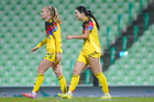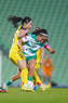 Torreón, Coahuila, 5 de enero de 2026. Scarlett Camberos y Doménica Rodríguez, durante el partido correspondiente a la jornada 1 del torneo Clausura 2026 de la Liga BBVA MX Femenil, entre las Guerreras de Santos Laguna y las Águilas del América, realizado en el estadio Corona. Foto: Imago7/ Erick Saavedra