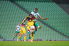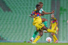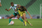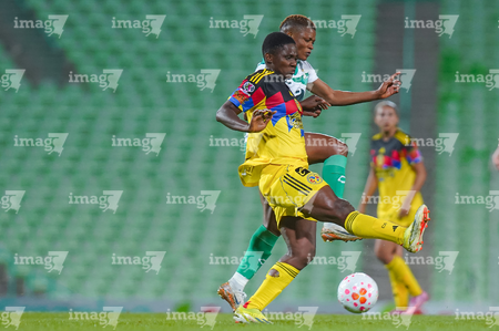 Torreón, Coahuila, 5 de enero de 2026. Sandra Nabweteme y Chidinma Okeke, durante el partido correspondiente a la jornada 1 del torneo Clausura 2026 de la Liga BBVA MX Femenil, entre las Guerreras de Santos Laguna y las Águilas del América, realizado en el estadio Corona. Foto: Imago7/Saul Perales