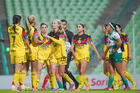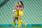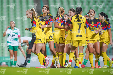 Torreón, Coahuila, 5 de enero de 2026. Jugadoras del América femenil en festejo de gol, durante el partido correspondiente a la jornada 1 del torneo Clausura 2026 de la Liga BBVA MX Femenil, entre las Guerreras de Santos Laguna y las Águilas del América, realizado en el estadio Corona. Foto: Imago7/ Erick Saavedra