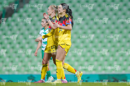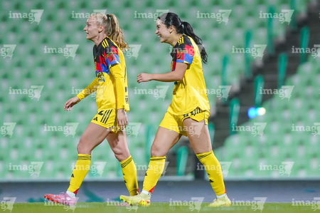 Torreón, Coahuila, 5 de enero de 2026. Scarlett Camberos y Lia Romero, durante el partido correspondiente a la jornada 1 del torneo Clausura 2026 de la Liga BBVA MX Femenil, entre las Guerreras de Santos Laguna y las Águilas del América, realizado en el estadio Corona. Foto: Imago7/Saul Perales