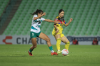 Torreón, Coahuila, 5 de enero de 2026. Scarlett Camberos y Yessenia Novella, durante el partido correspondiente a la jornada 1 del torneo Clausura 2026 de la Liga BBVA MX Femenil, entre las Guerreras de Santos Laguna y las Águilas del América, realizado en el estadio Corona. Foto: Imago7/Saul Perales
