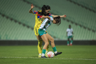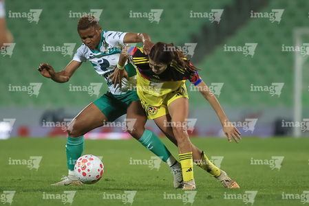 Torreón, Coahuila, 5 de enero de 2026. Nicol de León y Valentina Murrieta, durante el partido correspondiente a la jornada 1 del torneo Clausura 2026 de la Liga BBVA MX Femenil, entre las Guerreras de Santos Laguna y las Águilas del América, realizado en el estadio Corona. Foto: Imago7/ Erick Saavedra