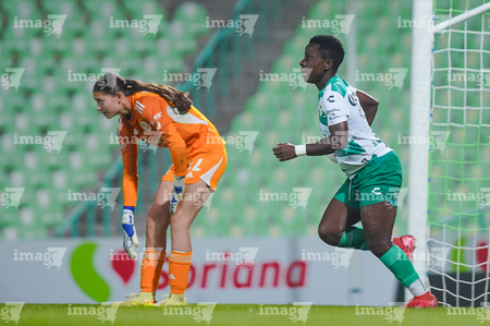 Torreón, Coahuila, 5 de enero de 2026. Mayra Santana y Arantza Segura, durante el partido correspondiente a la jornada 1 del torneo Clausura 2026 de la Liga BBVA MX Femenil, entre las Guerreras de Santos Laguna y las Águilas del América, realizado en el estadio Corona. Foto: Imago7/ Erick Saavedra