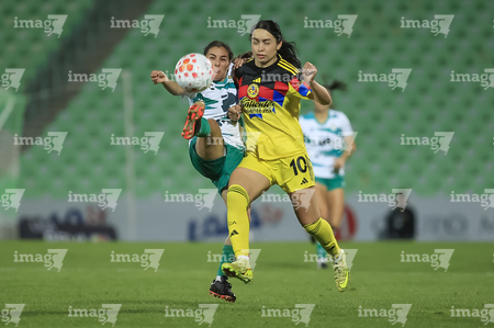 Torreón, Coahuila, 5 de enero de 2026. Yessenia Novella y Scarlett Camberos, durante el partido correspondiente a la jornada 1 del torneo Clausura 2026 de la Liga BBVA MX Femenil, entre las Guerreras de Santos Laguna y las Águilas del América, realizado en el estadio Corona. Foto: Imago7/Saul Perales