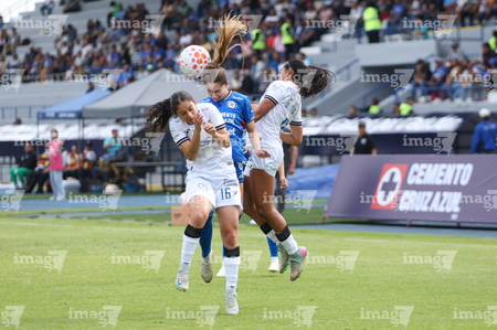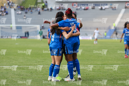 Cuernavaca, Morelos, 31 de enero de 2026. Michaela Abam, Daniela Calderón y Cristina Montaño en festejo de gol, durante el partido correspondiente a la jornada 6 del torneo Clausura 2026 de la Liga BBVA MX Femenil, entre la Máquina Celeste del Cruz Azul y el Club Querétaro, realizado en el estadio Centenario. Foto: Imago7/ Daniel Sydney