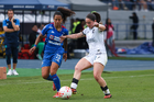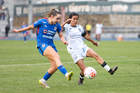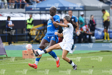 Cuernavaca, Morelos, 31 de enero de 2026. Michaela Abam y Edith Carmona, durante el partido correspondiente a la jornada 6 del torneo Clausura 2026 de la Liga BBVA MX Femenil, entre la Máquina Celeste del Cruz Azul y el Club Querétaro, realizado en el estadio Centenario. Foto: Imago7/ Daniel Sydney