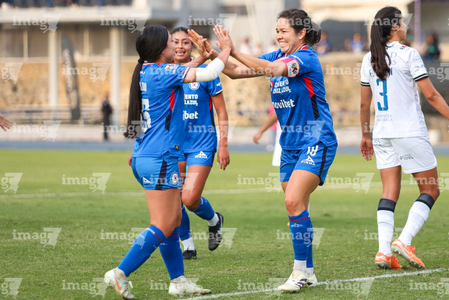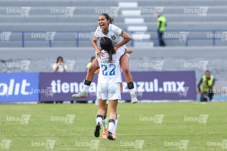 Cuernavaca, Morelos, 31 de enero de 2026. Edith Carmona y Victoria Ceceña en festejo de gol, durante el partido correspondiente a la jornada 6 del torneo Clausura 2026 de la Liga BBVA MX Femenil, entre la Máquina Celeste del Cruz Azul y el Club Querétaro, realizado en el estadio Centenario. Foto: Imago7/ Daniel Sydney