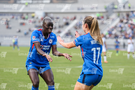 Cuernavaca, Morelos, 31 de enero de 2026. Michaela Abam y Cristina Montaño en festejo de gol, durante el partido correspondiente a la jornada 6 del torneo Clausura 2026 de la Liga BBVA MX Femenil, entre la Máquina Celeste del Cruz Azul y el Club Querétaro, realizado en el estadio Centenario. Foto: Imago7/ Daniel Sydney