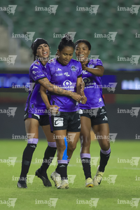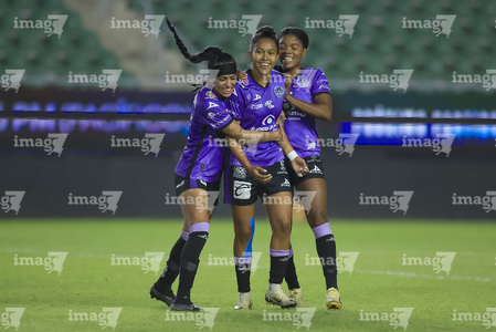 Mazatlán, Sinaloa, 31 de enero de 2026. Ambar González, Yoselyn López y Taiwo Lawal en festejo de gol, durante el partido correspondiente a la jornada 6 del torneo Clausura 2026 de la Liga BBVA MX Femenil, entre las Cañoneras del Mazatlán FC y las Centellas del Necaxa, realizado en el estadio El Encanto. Foto: Imago7/ Saul Perales