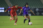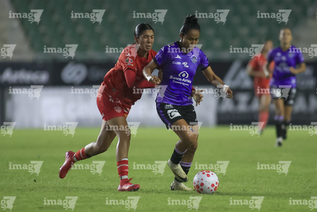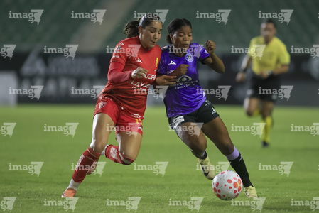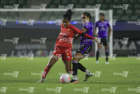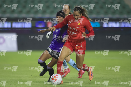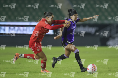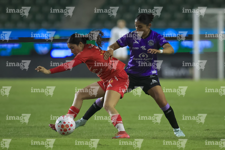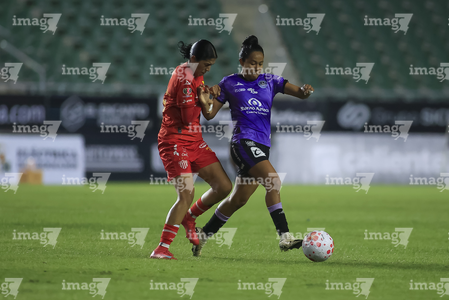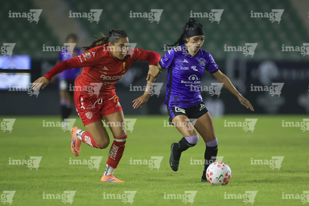 Mazatlán, Sinaloa, 31 de enero de 2026. Winibian Peralta y Karen De León, durante el partido correspondiente a la jornada 6 del torneo Clausura 2026 de la Liga BBVA MX Femenil, entre las Cañoneras del Mazatlán FC y las Centellas del Necaxa, realizado en el estadio El Encanto. Foto: Imago7/ Saul Perales