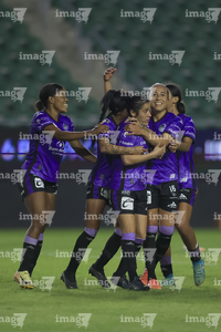 Mazatlán, Sinaloa, 31 de enero de 2026. Jugadoras del Mazatlán femenil en festejo de gol, durante el partido correspondiente a la jornada 6 del torneo Clausura 2026 de la Liga BBVA MX Femenil, entre las Cañoneras del Mazatlán FC y las Centellas del Necaxa, realizado en el estadio El Encanto. Foto: Imago7/ Saul Perales