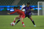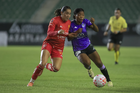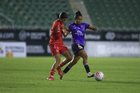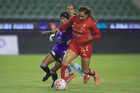 Mazatlán, Sinaloa, 31 de enero de 2026. Ahtziri Méndez (I) y Jada Barnett (D), durante el partido correspondiente a la jornada 6 del torneo Clausura 2026 de la Liga BBVA MX Femenil, entre las Cañoneras del Mazatlán FC y las Centellas del Necaxa, realizado en el estadio El Encanto. Foto: Imago7/ Saul Perales