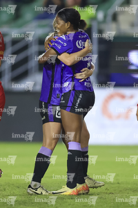 Mazatlán, Sinaloa, 31 de enero de 2026. Conni Herrera y Ambar González en festejo de gol, durante el partido correspondiente a la jornada 6 del torneo Clausura 2026 de la Liga BBVA MX Femenil, entre las Cañoneras del Mazatlán FC y las Centellas del Necaxa, realizado en el estadio El Encanto. Foto: Imago7/ Saul Perales