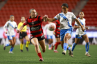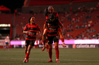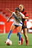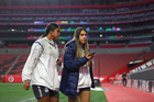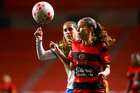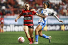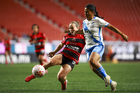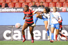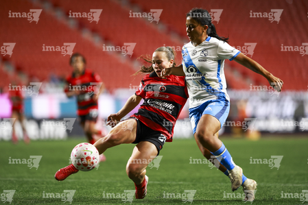 Tijuana, Baja California, 31 de enero de 2026. Roselord Borgella y Karyme Martínez, durante el partido correspondiente a la jornada 6 del torneo Clausura 2026 de la Liga BBVA MX Femenil, entre las Xolas de Tijuana y el Club Puebla, realizado en el estadio Caliente. Foto: Imago7/ Alejandro Gutiérrez Mora