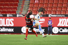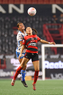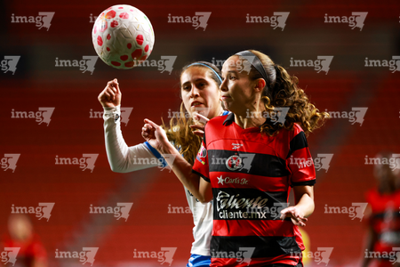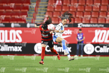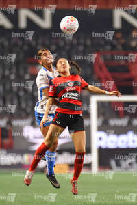 Tijuana, Baja California, 31 de enero de 2026. Abigail López y Michel Fong, durante el partido correspondiente a la jornada 6 del torneo Clausura 2026 de la Liga BBVA MX Femenil, entre las Xolas de Tijuana y el Club Puebla, realizado en el estadio Caliente. Foto: Imago7/ David Vega