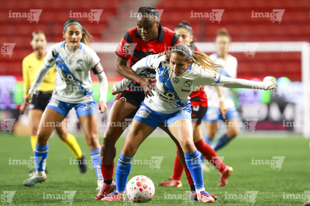 Tijuana, Baja California, 31 de enero de 2026. Roselord Borgella y Miriam García, durante el partido correspondiente a la jornada 6 del torneo Clausura 2026 de la Liga BBVA MX Femenil, entre las Xolas de Tijuana y el Club Puebla, realizado en el estadio Caliente. Foto: Imago7/ David Vega