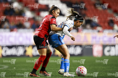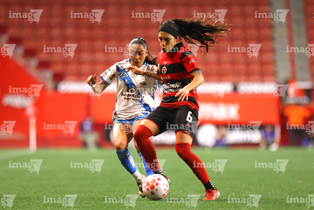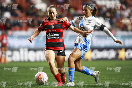 Tijuana, Baja California, 31 de enero de 2026. Karyme Martínez y Danielle Fuentes, durante el partido correspondiente a la jornada 6 del torneo Clausura 2026 de la Liga BBVA MX Femenil, entre las Xolas de Tijuana y el Club Puebla, realizado en el estadio Caliente. Foto: Imago7/ David Vega