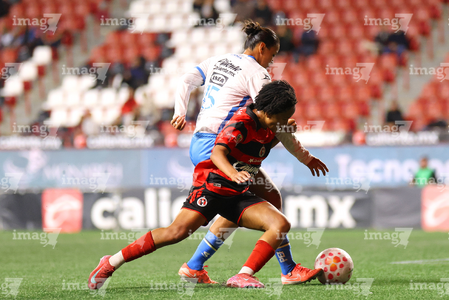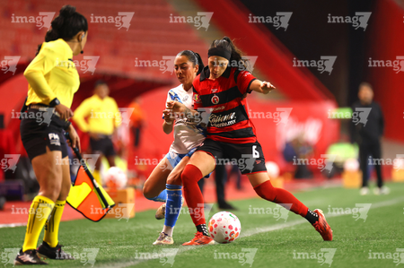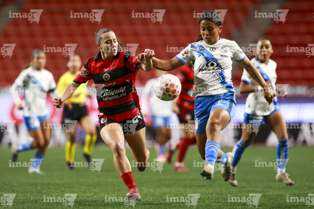Tijuana, Baja California, 31 de enero de 2026. Deisy Ojeda y Luisa De Alba, durante el partido correspondiente a la jornada 6 del torneo Clausura 2026 de la Liga BBVA MX Femenil, entre las Xolas de Tijuana y el Club Puebla, realizado en el estadio Caliente. Foto: Imago7/ David Vega