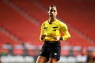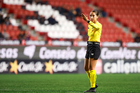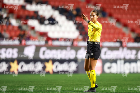 Tijuana, Baja California, 31 de enero de 2026. Mariana Gómez Jaime, árbitra central, durante el partido correspondiente a la jornada 6 del torneo Clausura 2026 de la Liga BBVA MX Femenil, entre las Xolas de Tijuana y el Club Puebla, realizado en el estadio Caliente. Foto: Imago7/ David Vega