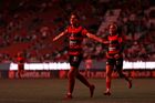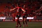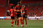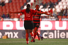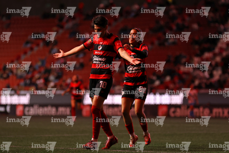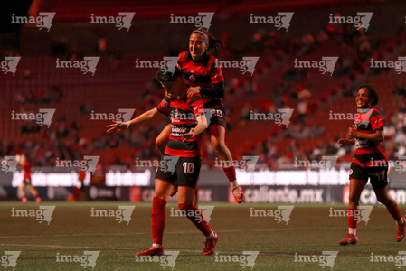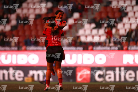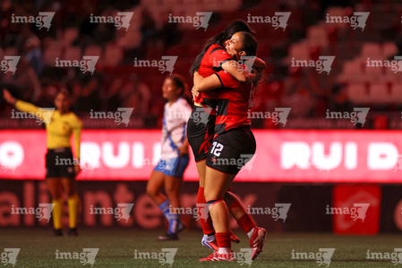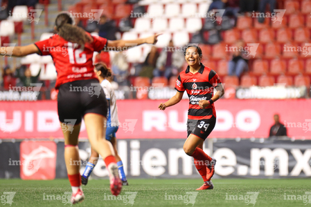 Tijuana, Baja California, 31 de enero de 2026. Kader Hançar y Daniela Carrandi en festejo de gol, durante el partido correspondiente a la jornada 6 del torneo Clausura 2026 de la Liga BBVA MX Femenil, entre las Xolas de Tijuana y el Club Puebla, realizado en el estadio Caliente. Foto: Imago7/ David Vega