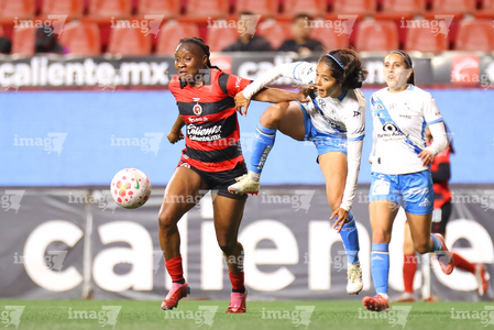 Tijuana, Baja California, 31 de enero de 2026. Jaqueline González y Amogelang Motau, durante el partido correspondiente a la jornada 6 del torneo Clausura 2026 de la Liga BBVA MX Femenil, entre las Xolas de Tijuana y el Club Puebla, realizado en el estadio Caliente. Foto: Imago7/ David Vega