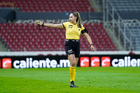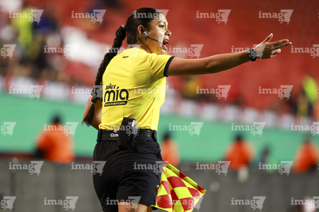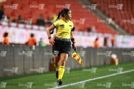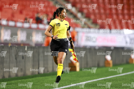 Tijuana, Baja California, 21 de febrero de 2026. María Fernanda Ávila Oropeza, árbitro asistente, durante el partido correspondiente a la jornada 10 del torneo Clausura 2026 de la Liga BBVA MX Femenil, entre las Xolas de Tijuana y las Esmeraldas del León, realizado en el estadio Caliente. Foto: Imago7/ Alejandro Gutiérrez Mora