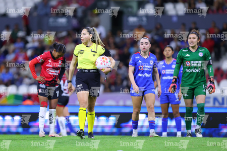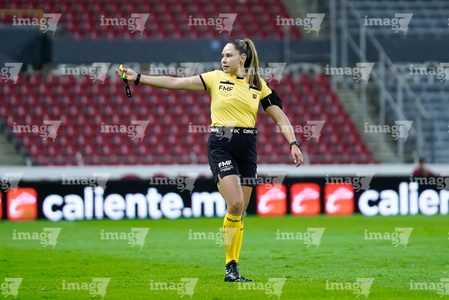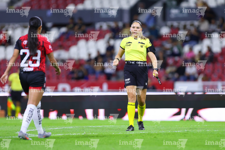 Guadalajara, Jalisco, 20 de febrero de 2026. Ana Cristina Guarneros, árbitra central, durante el partido correspondiente a la jornada 10 del torneo Clausura 2026 de la Liga BBVA MX Femenil, entre las Rojinegras del Atlas y la Máquina Celeste del Cruz Azul, realizado en el estadio Jalisco. Foto: Imago7/ Alejandro Lias