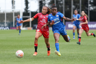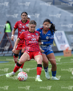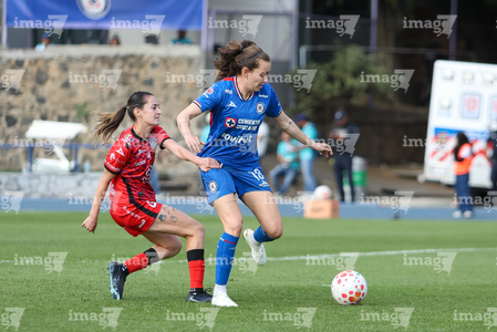 Cuernavaca, Morelos, 21 de marzo de 2026. Daniela Solera y Cristina Montaño, durante el partido correspondiente a la jornada 13 del torneo Clausura 2026 de la Liga BBVA MX Femenil, entre la Máquina Celeste del Cruz Azul y las Cañoneras del Mazatlán FC, realizado en el estadio de la Unidad Deportiva Centenario. Foto: Imago7/ Daniel Sydney