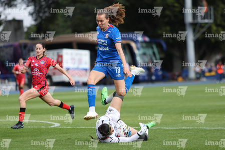Cuernavaca, Morelos, 21 de marzo de 2026. Vanessa Sánchez y Uchenna Kanu, durante el partido correspondiente a la jornada 13 del torneo Clausura 2026 de la Liga BBVA MX Femenil, entre la Máquina Celeste del Cruz Azul y las Cañoneras del Mazatlán FC, realizado en el estadio de la Unidad Deportiva Centenario. Foto: Imago7/ Daniel Sydney