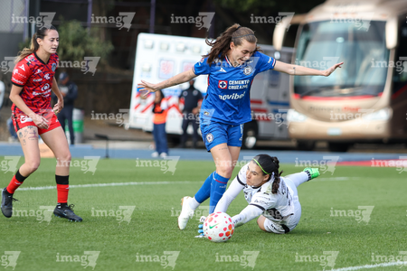 Cuernavaca, Morelos, 21 de marzo de 2026. Brenda Aleman y Daniela Calderón, durante el partido correspondiente a la jornada 13 del torneo Clausura 2026 de la Liga BBVA MX Femenil, entre la Máquina Celeste del Cruz Azul y las Cañoneras del Mazatlán FC, realizado en el estadio de la Unidad Deportiva Centenario. Foto: Imago7/ Daniel Sydney