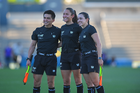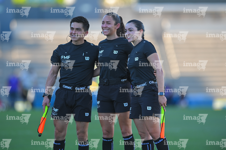 Ciudad Juárez, Chihuahua, 21 de marzo de 2026. Mario Edson Barrera, árbitro asistente, Ana Paola Hernández, árbitro central y Carolina Cepeda Ortíz, árbitro asistente, durante el partido correspondiente a la jornada 13 del torneo Clausura 2026 de la Liga BBVA MX Femenil, entre las Bravas de FC Juárez y las Guerreras de Santos Laguna, realizado en realizado en el estadio Olímpico Benito Juárez. Foto: Imago7/ José Zamora