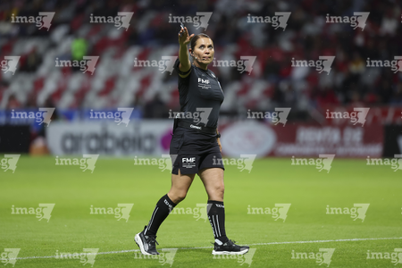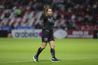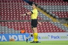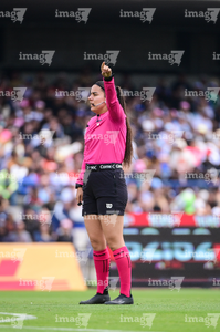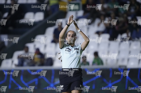 León, Guanajuato, 23 de marzo de 2026. Montserrat Pérez Comellas, árbitra central, durante el partido correspondiente a la jornada 13 del torneo Clausura 2026 de la Liga BBVA MX Femenil, entre las Esmeraldas del León y las Rojinegras del Atlas, realizado en el estadio León. Foto: Imago7/ Sebastian Laureano Miranda