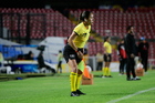 Querétaro, Querétaro, 21 de marzo de 2026. Karla González Arroyo, árbitra asistente, durante el partido correspondiente a la jornada 13 del torneo Clausura 2026 de la Liga BBVA MX Femenil, entre el Club Querétaro y las Xolas de Tijuana, realizado en el estadio La Corregidora. Foto: Imago7/ Pablo Ramírez